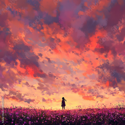 Serene Moment in Nature: A Silhouette Against a Vibrant Sunset Sky with Colorful Clouds and Blooming Flowers in the Foreground