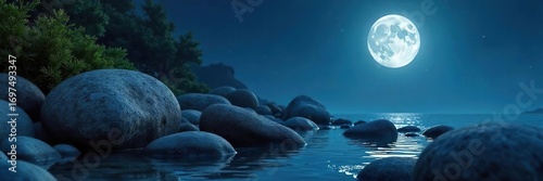 Serene Moonlight on Mossy Rocks A Peaceful Nighttime Nature Scene Ideal for Relaxation and Wellness Themes