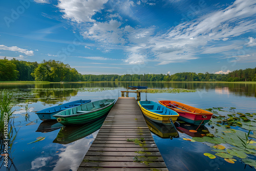 Serene Morning at Wl Lake: An Ideal Fishing Getaway Surrounded by Lush Greenery and Crystal Blue Waters