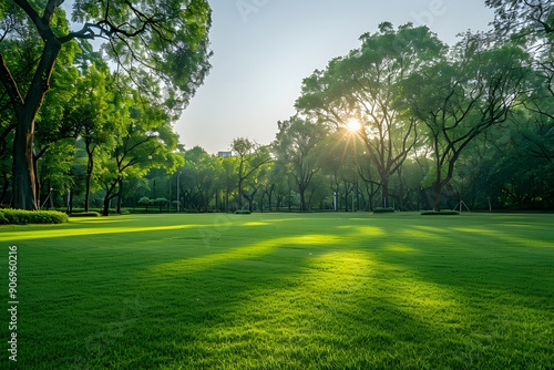 Serene Morning in a Lush Green Park with Sunlight Filtering Through Trees