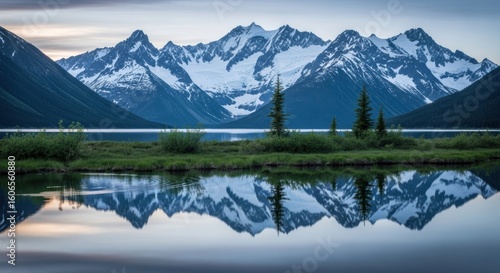 Serene mountain lake mirroring peaks