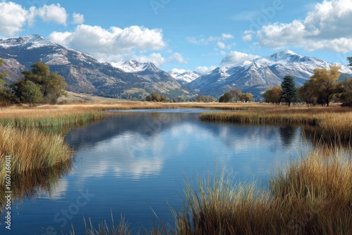 Serene mountain lake reflecting a vibrant autumn landscape under a cloudy blue sky