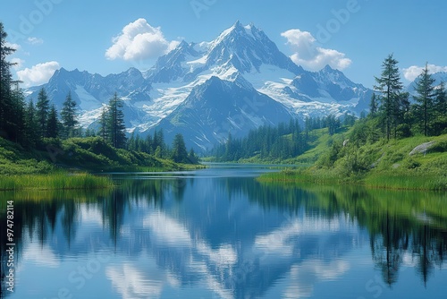 serene mountain lake reflecting snowcapped peaks under a dramatic sky lush forests frame the pristine waters creating a breathtaking landscape scene