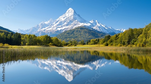 Serene mountain lake reflecting towering snow-capped peaks, surrounded by evergreen trees, ample space for text, high-end national geographic photography style, deep depth of field, Product
