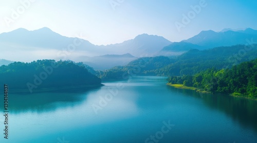 Serene Mountain Lake Reflections in Tranquil Natural Landscape with Misty Hills