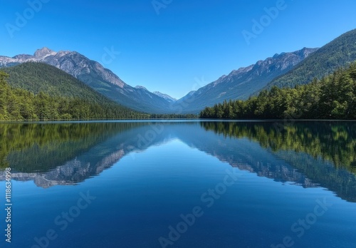 Serene Mountain Lake Surrounded by Lush Forests and Majestic Peaks Reflecting in Crystal Clear Waters on a Bright Sunny Day