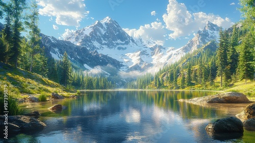 Serene Mountain Lake with Lush Greenery and Sunshine
