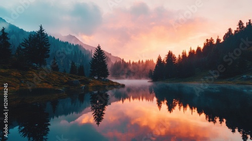 Serene Mountain Landscape at Dawn with Reflections and Mist over Tranquil Water