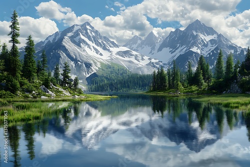 Serene mountain landscape with a reflective lake and lush greenery under a blue sky.