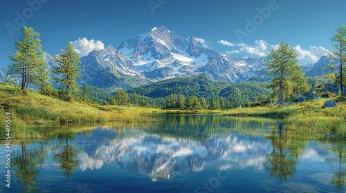 Serene mountain landscape with a reflective lake and lush greenery under a clear blue sky.
