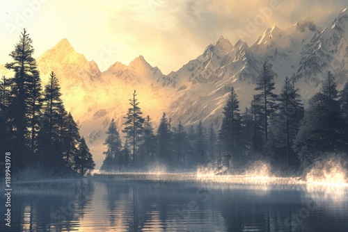 Serene Mountain Landscape with Reflection in Calm Waters at Dawn, Surrounded by Pine Trees and Majestic Peaks under a Glowing Sunrise