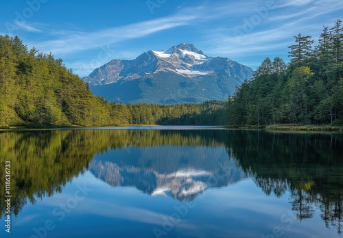 Serene Mountain Landscape with Reflections in Tranquil Lake Surrounded by Green Forest and Clear Blue Sky, Capturing Nature's Beauty in a Peaceful Setting