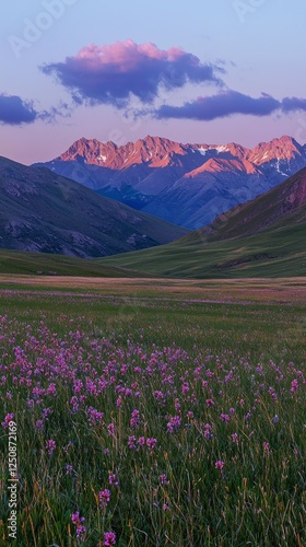 Serene Mountain Landscape with Wildflowers at Dusk Light