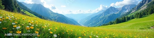 Serene mountain meadow bathed in sunlight, wildflowers blooming, lush green grass, clear blue sky, tranquil landscape Perfect for travel, nature, and serenity themes , ecology, landscape