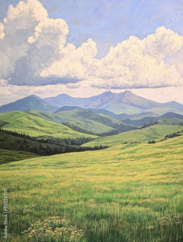 Serene Mountain Meadow Landscape - Rolling hills, vibrant green grass, fluffy clouds, distant mountains, peaceful scenery. Symbolizes nature, tranquility, freedom, vastness, and serenity.