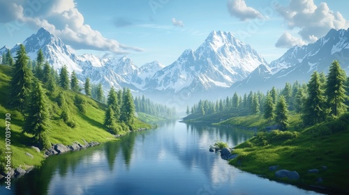 Serene mountain river winding through lush green valleys and forests reflecting snow capped peaks and inviting tranquility