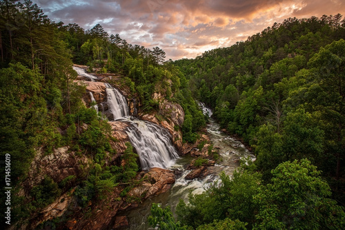 Serene mountain waterfall cascading through lush green forest at dusk