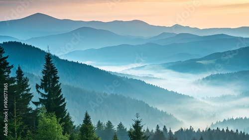 Serene Nature Background with Soft-Focus Forest and Sunrise Sky – Atmospheric Landscape for Design Use