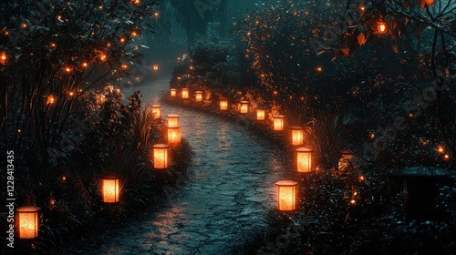 Serene Night Pathway Illuminated by Lanterns in Enchanted Garden