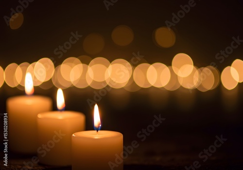 Serene Night: Three Candles Glowing in the Dark with Blurry Lights