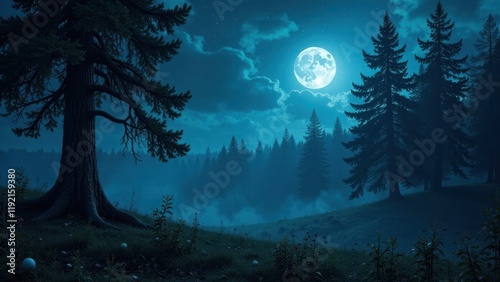 Serene Nighttime Forest Scene Under a Full Moon's Glow, Misty Meadow, Silhouetted Trees