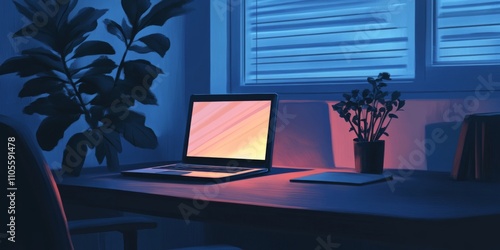 Serene Nighttime Home Office Workspace Laptop Plants Desk Minimalist Decor Digital Art