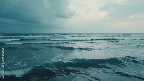 Serene Ocean Waves Under a Cloudy Sky, Wide Shot of Calm Sea with Small Waves, AI Generated Image