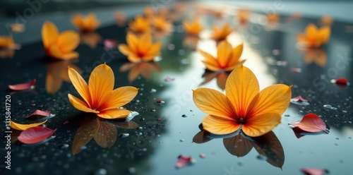 Serene orange blossoms float gently on a dark reflective surface, scattered petals adding a touch of natural elegance to the tranquil scene.