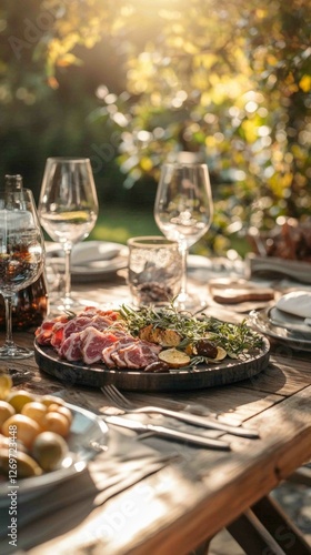 Serene Outdoor Dining Setup with Rustic Charm and Fresh Delicacies