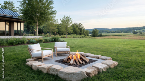 serene outdoor firepit scene with comfortable chairs and beautiful landscape