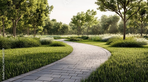 Serene Outdoor Scene with Curved Pathway and Lush Greenery