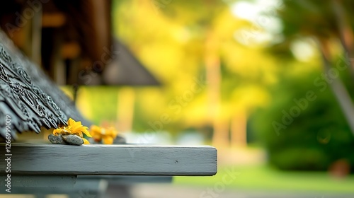 Serene outdoor setting with wooden tables adorned with flowers and stones, lush greenery in background
