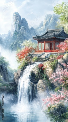 Serene pagoda atop a mountain waterfall surrounded by lush greenery and blossoms.