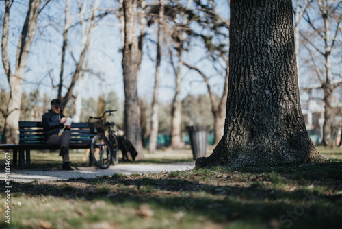 Serene park scene with man relaxing on bench enjoying peaceful autumn day.