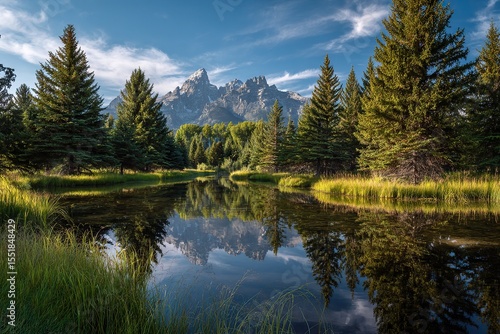 Serene park view with towering pine trees, reflecting pools, meadow, and mountains bathed in golden sunlight, tranquil nature scene.