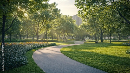 Serene Path Through the Sun-Dappled Forest: A winding paved path meanders through a verdant forest, bathed in the warm glow of morning sunlight.