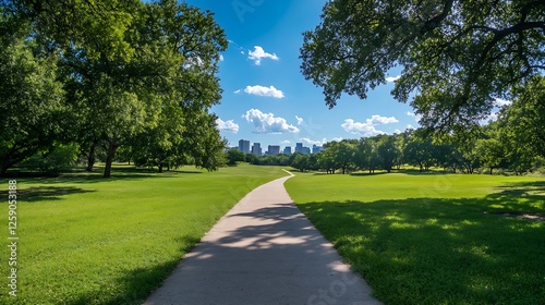 Serene Pathway in a Lush Green Park with City Skyline on the Horizon : Generative AI
