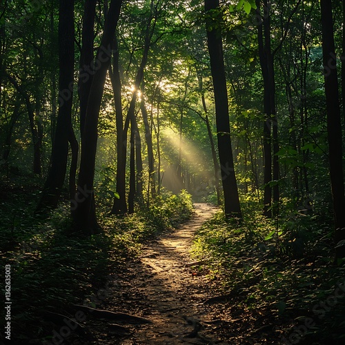 Serene Pathway Through Lush Green Forest with Dappled Sunlight
