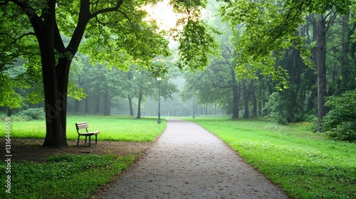 Serene Pathway Through Lush Green Park Surrounded by Misty Trees in Early Morning Light