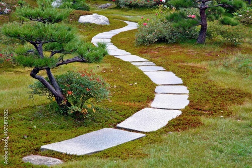 Serene pathway winds through a meticulously landscaped Japanese garden