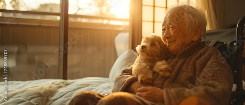 Serene photo of a senior person in a wheelchair sharing a calming moment with their dog on a balcony at sunset