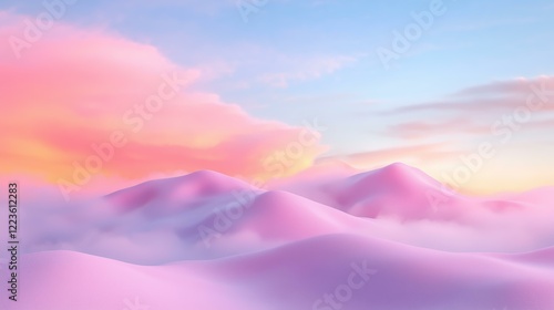 Serene pink hills enveloped in mist at golden sunset with soft pastel sky