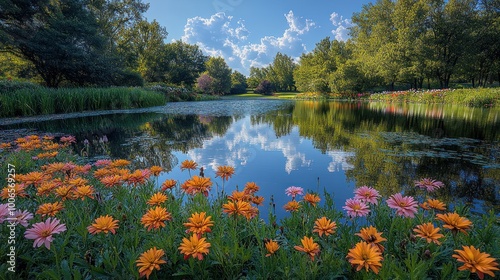 Serene Pond with Blooming Flowers