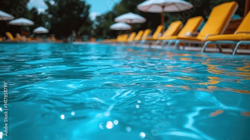 Serene poolside view with yellow loungers under umbrellas on a sunny day
