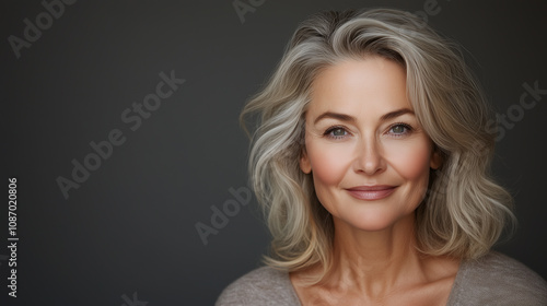 serene portrait of woman with silver hair, showcasing natural beauty and confidence. Her warm smile radiates positivity and grace.