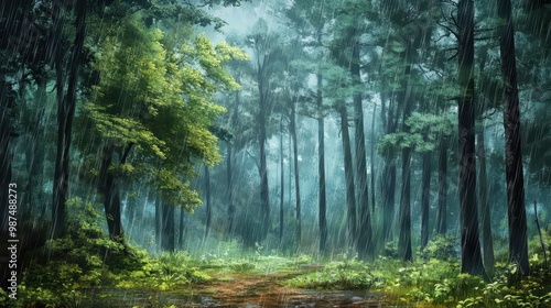 Serene Rainy Forest Landscape with Lush Greenery and Tall Trees in a Misty Atmosphere