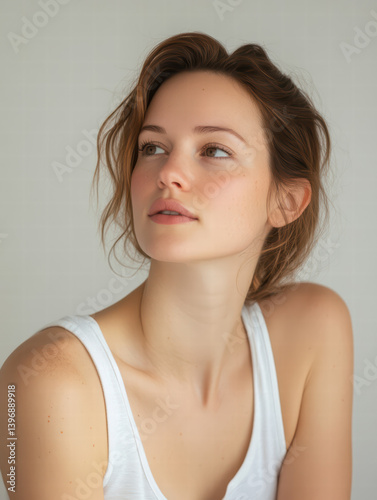 Serene Reflection: A close-up portrait captures a woman's thoughtful gaze, her expression conveying a sense of peace and introspective contemplation.