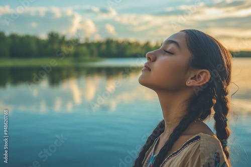 Serene Reflection: Young Girl Meditating by Tranquil Lake at Sunset