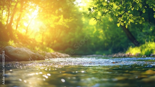 Serene river flowing through sunlit forest with lush green trees and rocks