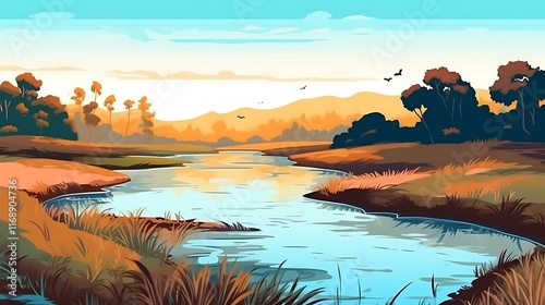 Serene River Landscape at Sunset Golden Hour